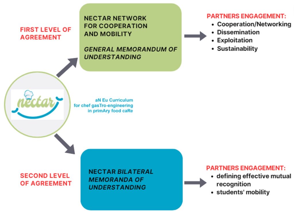 Based these premises, NECTAR’s Partners agreed to establish a NECTAR Network for Cooperation and Mobility (NNCM), extending this commitment to collaboration from the project partnership to any external actor interested in the CGE Curriculum implementation and providing education, training, placements and/or assessment, validation and recognition in the culinary field in Europe. Future collaboration may focus on networking or dissemination or developing concrete initiatives supporting students’ mobility and mutual recognition of qualifications across countries.